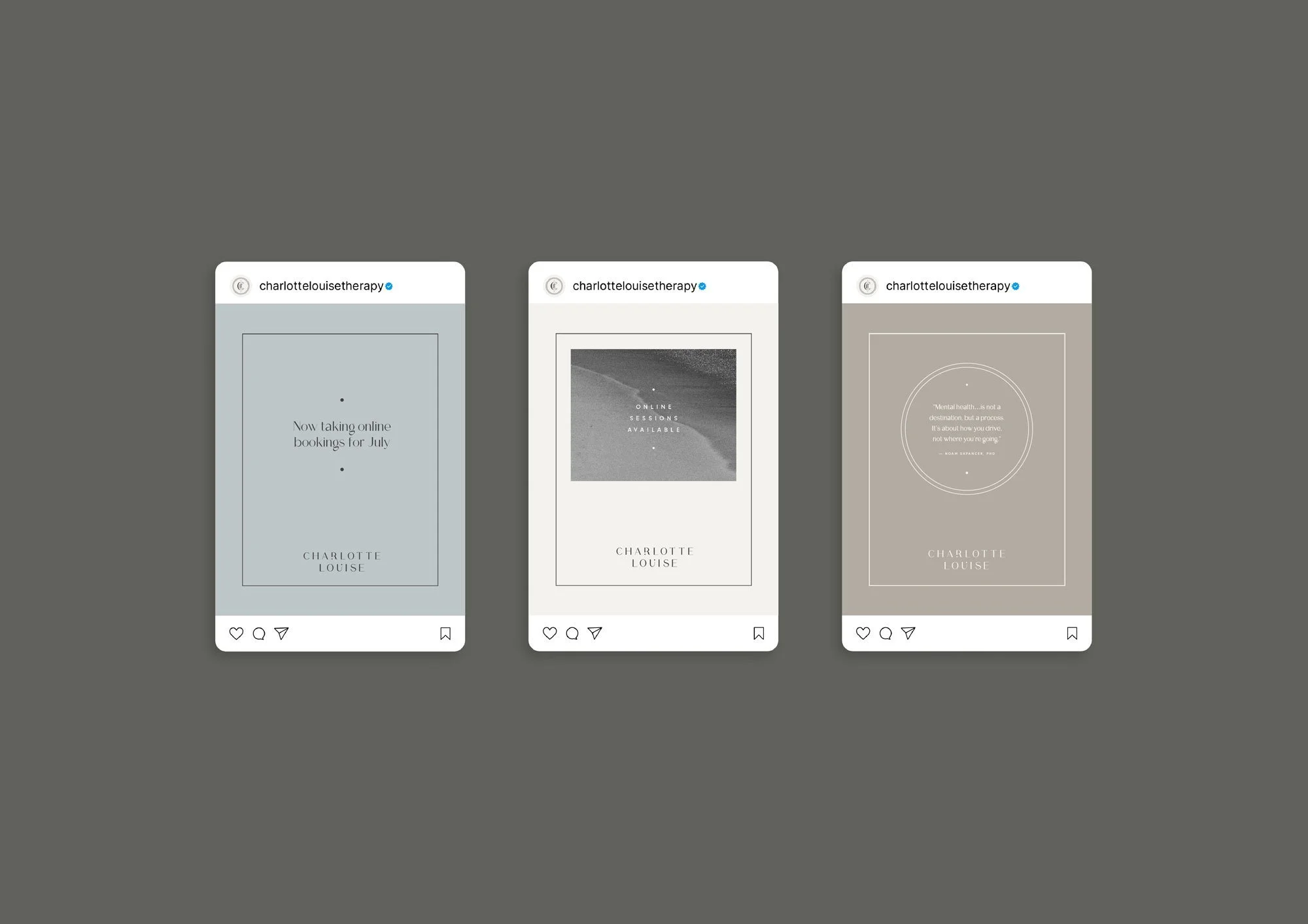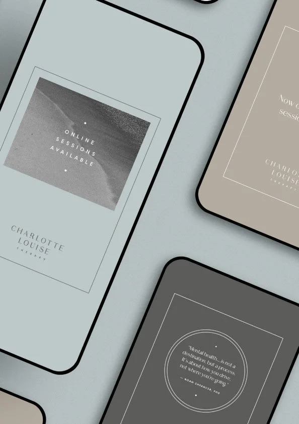 Charlotte Louise Therapy partnered with Colton Creative to develop a calming, professional brand identity paired with social media design and detailed brand guidelines. The brand blends soft, grounding colours with modern typography and thoughtful imagery to create a sense of warmth and trust. Designed to feel approachable yet refined, the visuals translate seamlessly across print and digital, giving Charlotte a cohesive presence that connects authentically with her clients