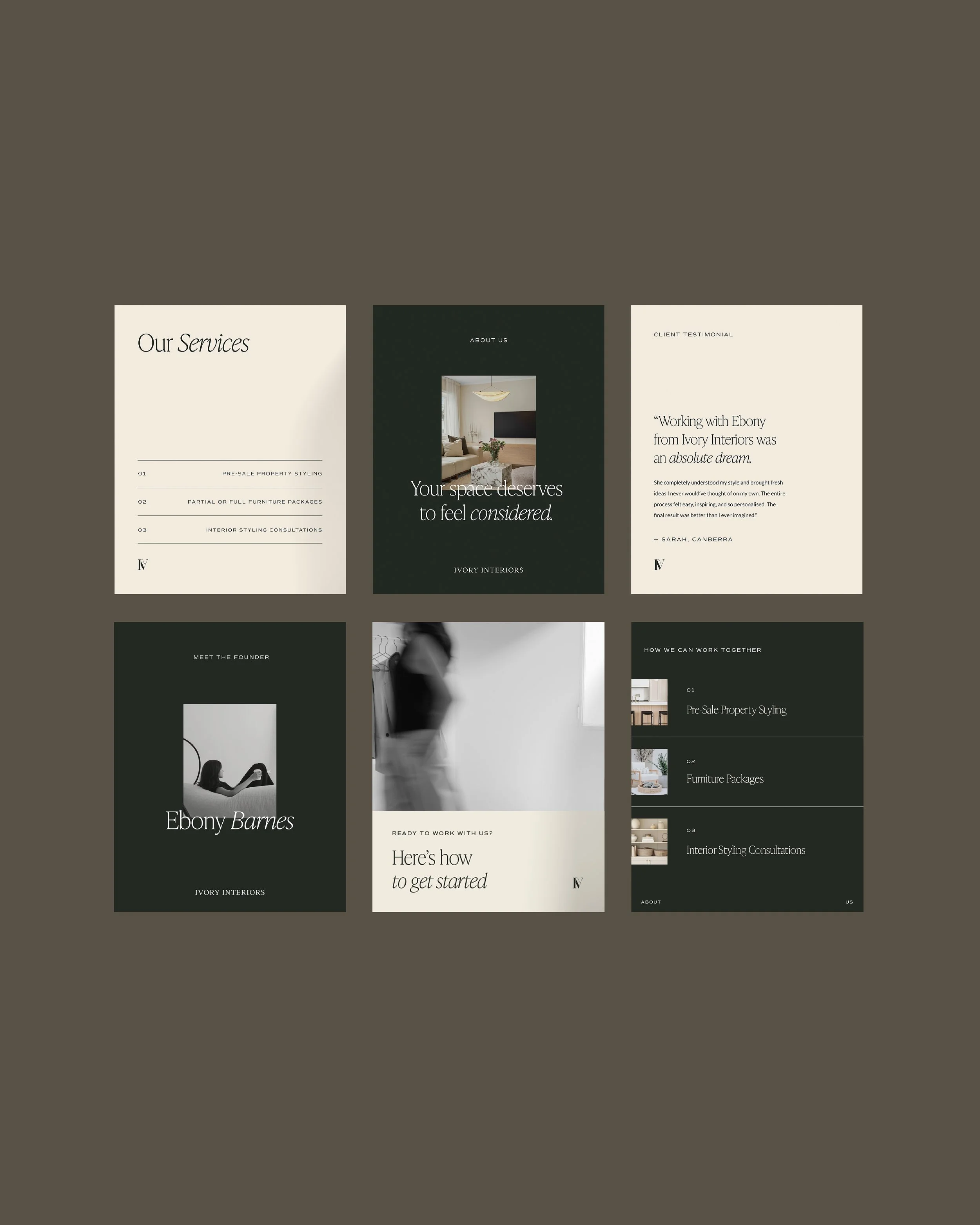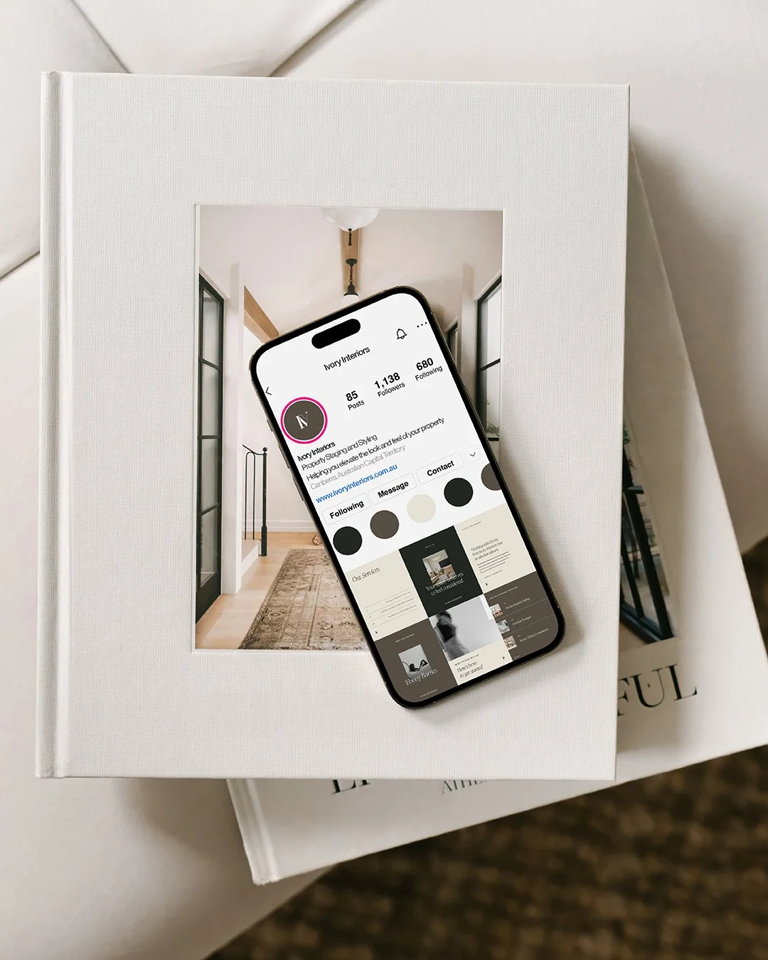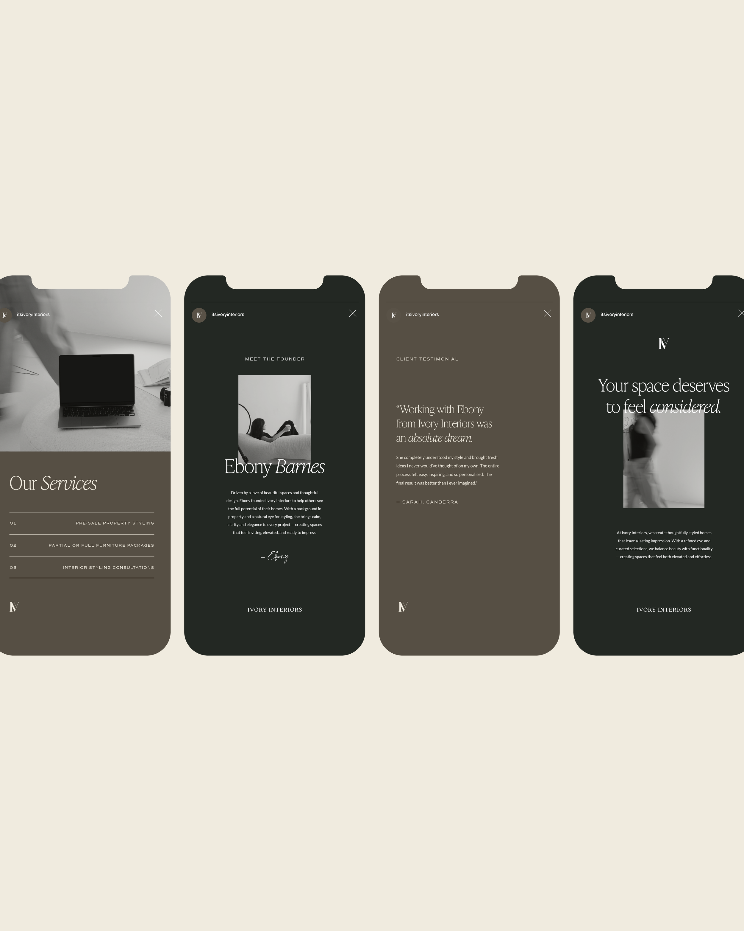 A refined brand direction and social presence for Ivory Interiors.
